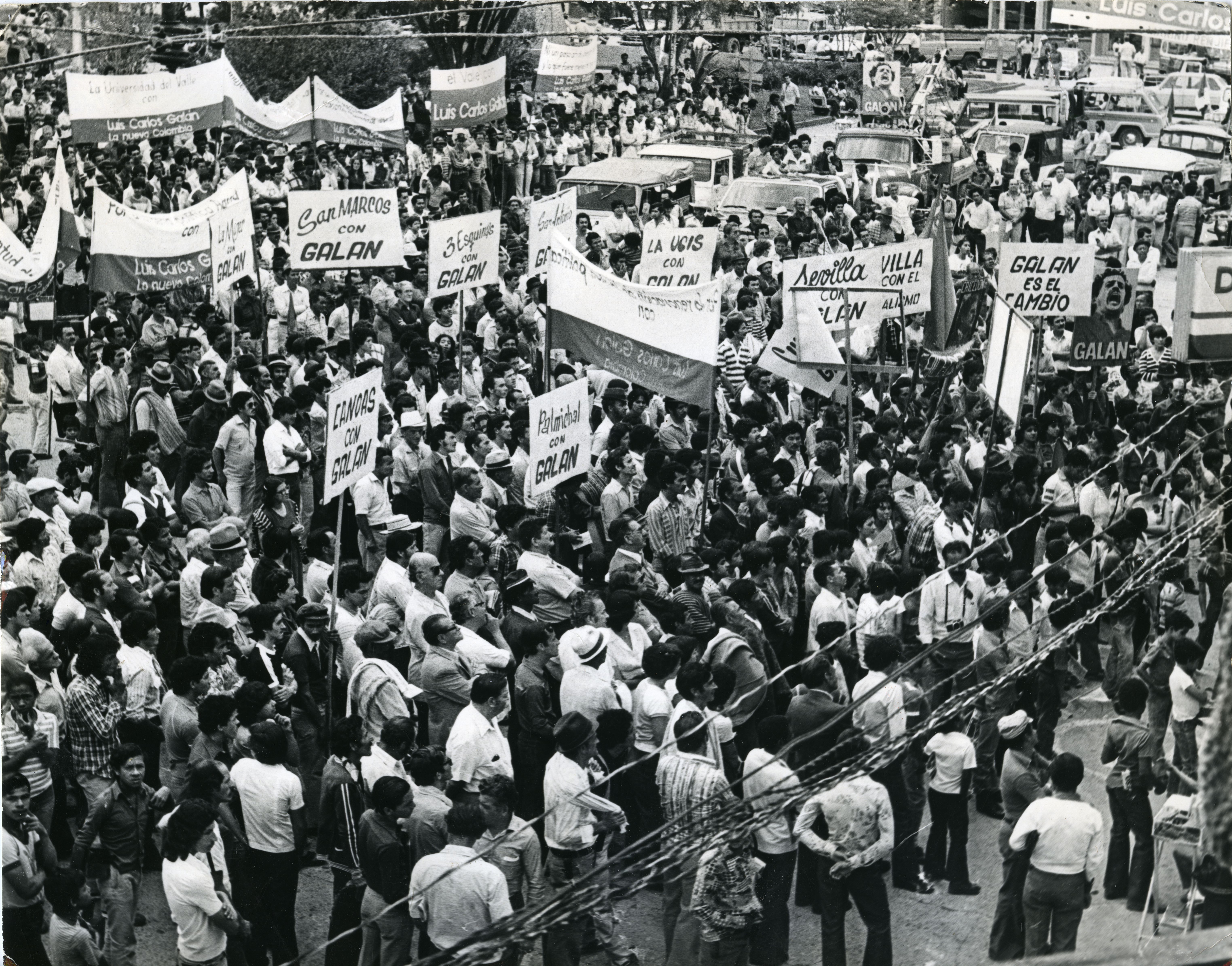 Luis Carlos Galán Sarmiento, (Bucaramanga, 1943 – Bogotá, 1989). Fue abogado, periodista, economista y político colombiano, estuvo influenciado por el caudillo liberal Jorge Eliécer Gaitán. Galán ha sido considerado uno de los grandes políticos del Partido Liberal del siglo XX. Fue candidato a la presidencia de Colombia en 1982 y 1986 por el Nuevo Liberalismo, y en 1989 por el Partido Liberal Colombiano, para las elecciones de 1990. En la gráfica, evento de Luis Carlos Galán Sarmiento, quien en ese momento era candidato a la presidencia de la república, él se encuentra recorriendo el Valle del Cauca. Se aprecia multitud de seguidores unos con pendones y letreros en alusión a su candidatura