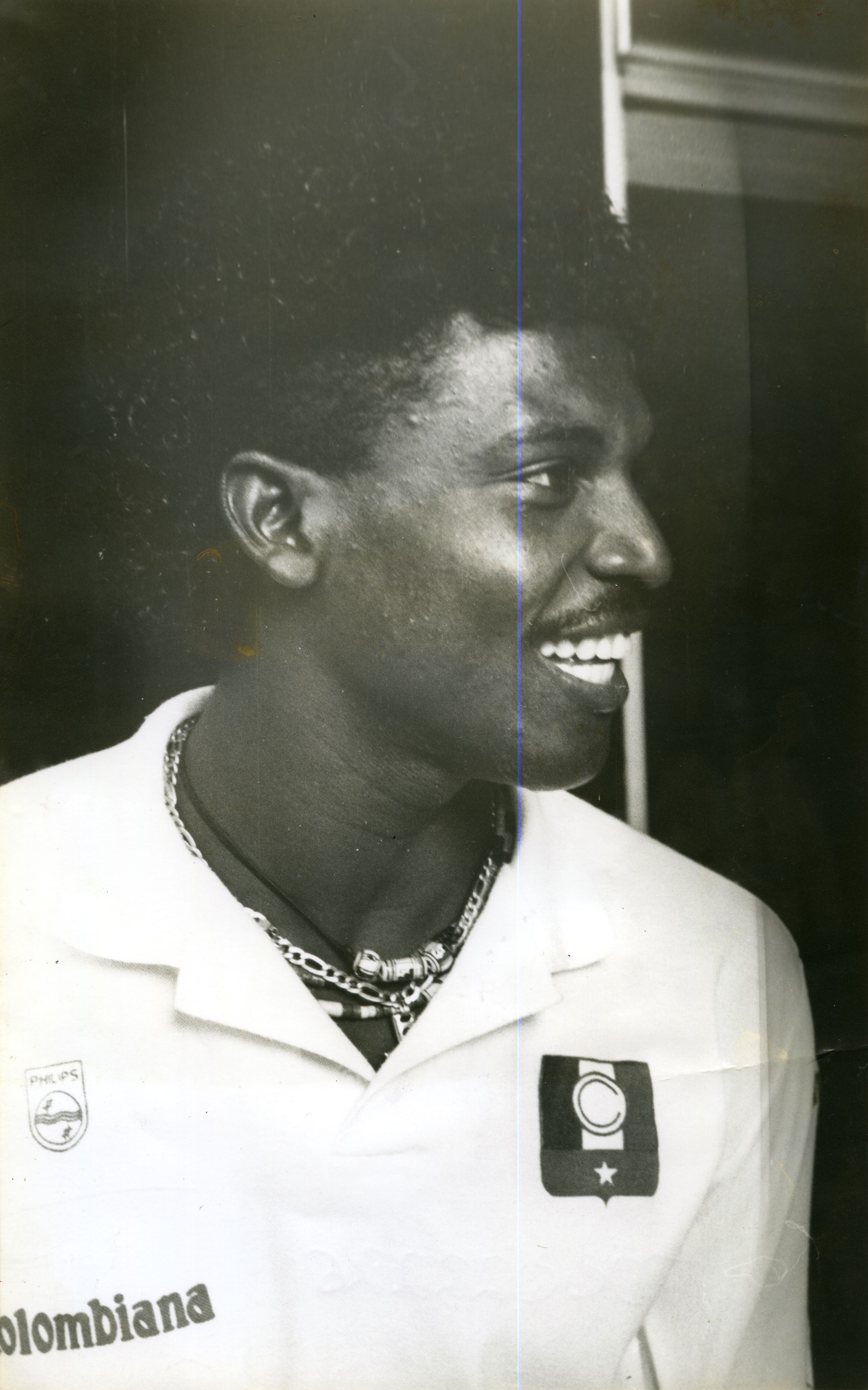 Fotografía de plano medio corto de Nestor Ortiz, donde se ve sonriente con un camibuso que tiene un escrito que dice Colombiana y un escudo pequeño al lado izquierdo del pecho; en su cuello se le ve diferentes collares y una cadena,