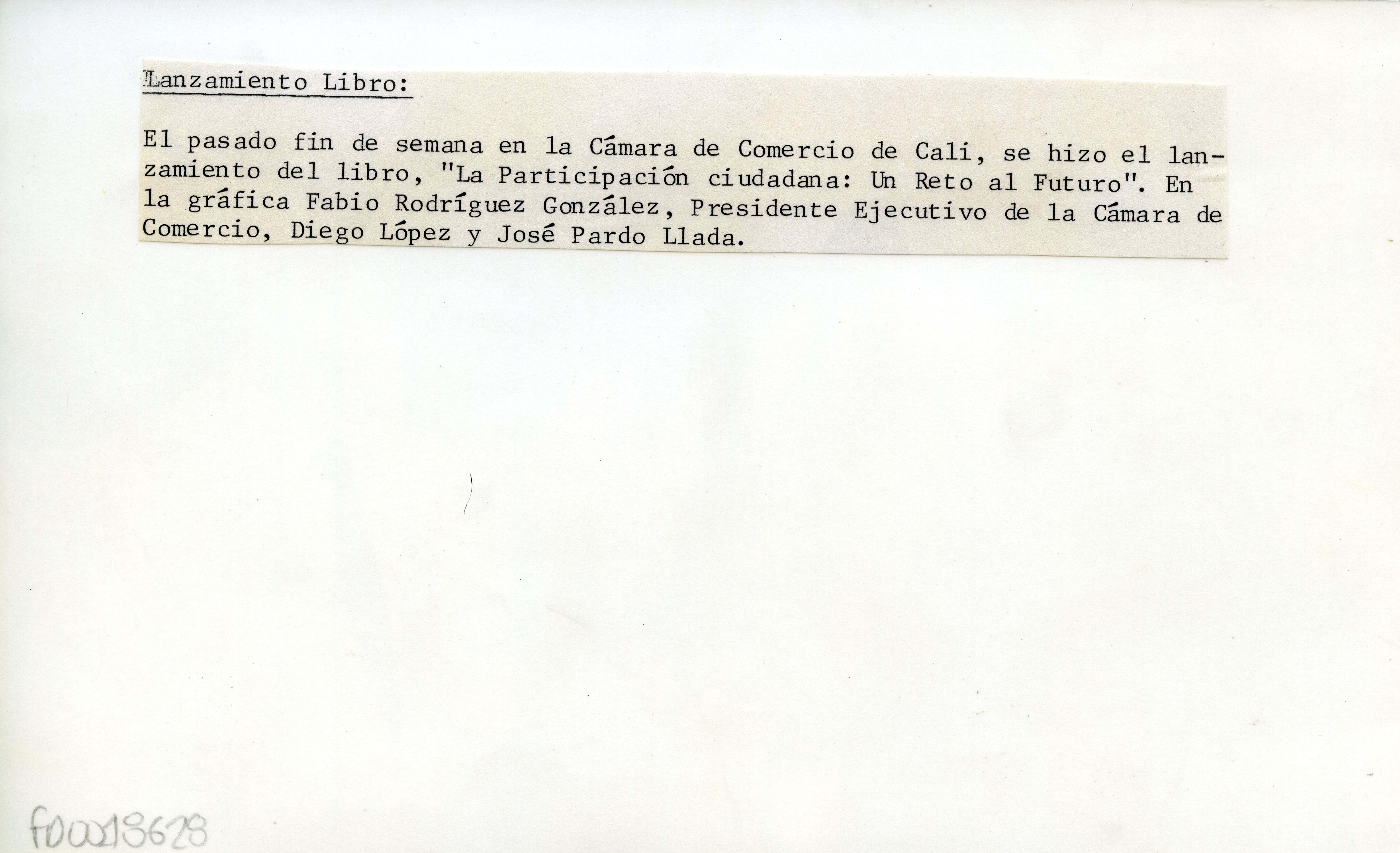 Evento social. El pasado fin de semana en la Cámara de Comercio de Cali, se hizo el lanzamientodel libro "La Participación Ciudadana: Un Reto al Futuro". En la gráfica Fabio Rodríguez González, presidente ejecutivo de la Cámara de Comercio, Diego López y José Pardo Llada