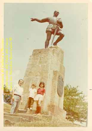 Horacio Arce con sus hijos Adriana y Andrés posando para una foto al frente de la estatua de Sebastián de Belalcázar (obra del escultor español Victorio Macho, elaborada en bronce). Cali. 1970.