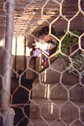 Plano Medio. Se aprecia a través de una reja a un niño sentado en unas escaleras, con un gato en sus brazos y su mirada hacia la cámara. La luz del sol se refleja sobre las escaleras y una pared de ladrillo a la vista.
