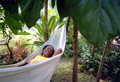 Plano medio. Exterior día. Mujer en hamaca en primer plano, lateral izquierdo. Destaca en todo el campo visual la zona verde.