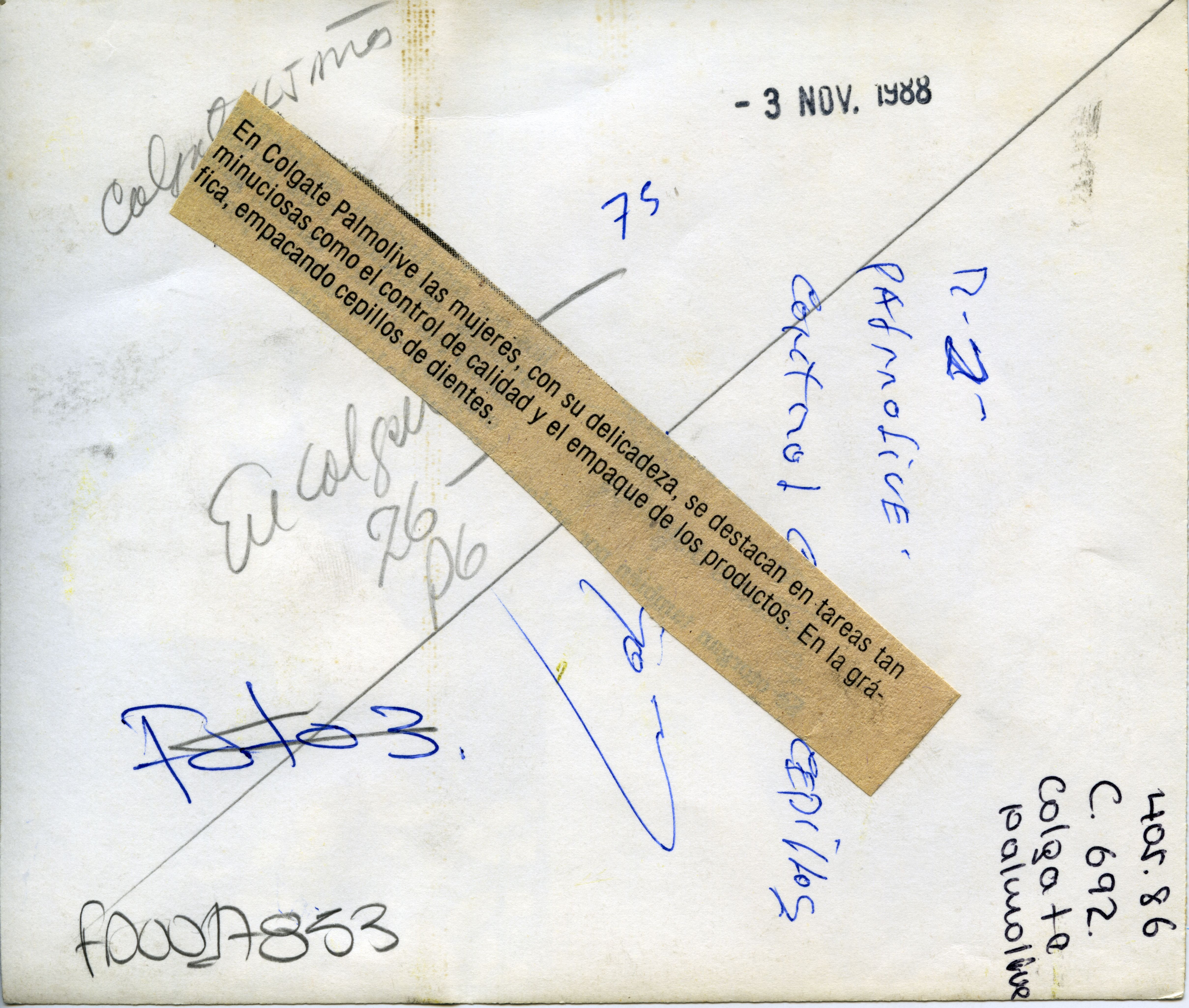 Al reverso de la fotografía se anexa recorte: "En Colgate Palmolive las mujeres, con su delicadeza, se destacan en tareas tan minuciosas como el control de calidad y el empaque de los productos. En la gráfica, empacando cepillos de dientes."