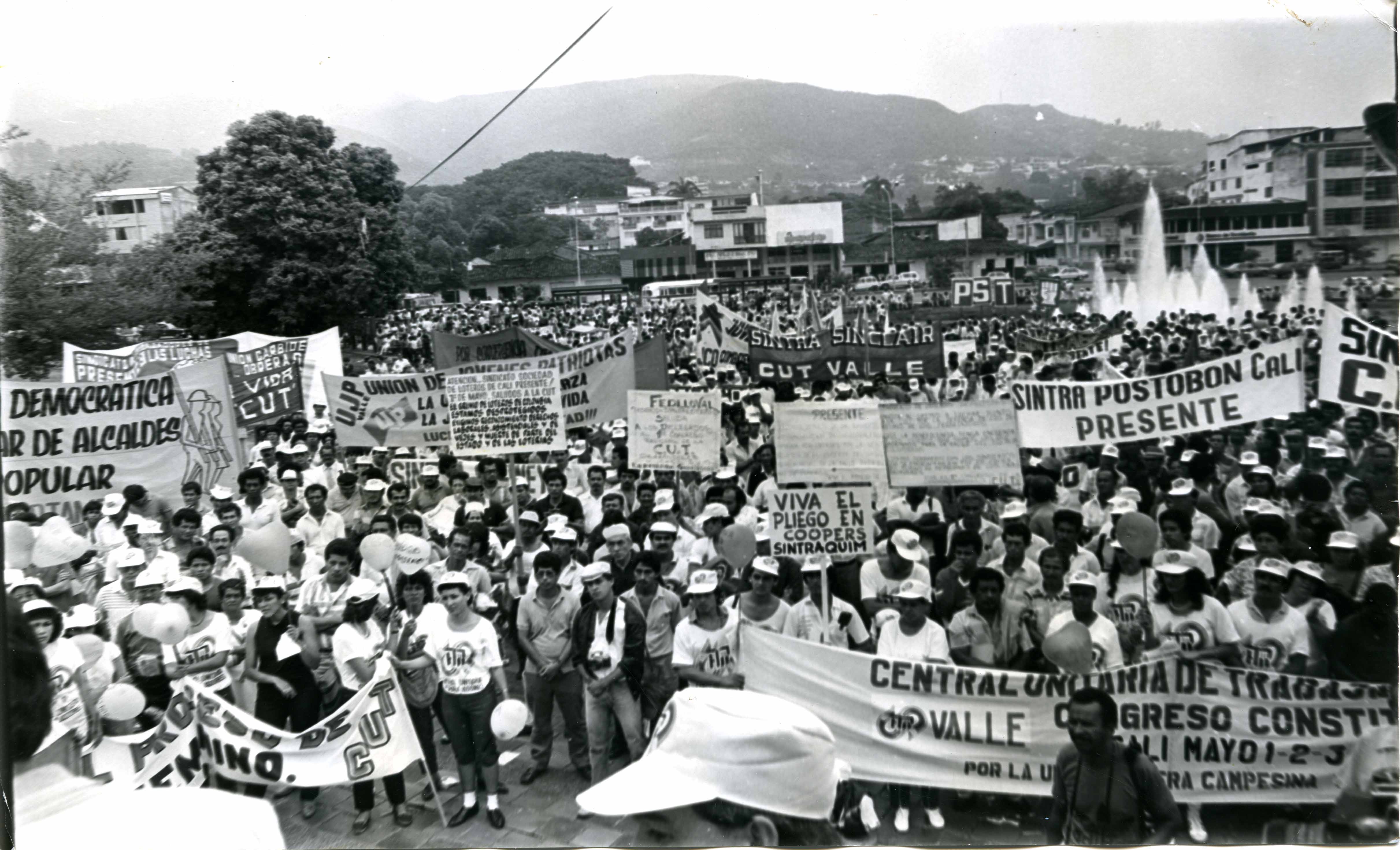Celebración del día internacional del Trabajo en Cali. Marcha del primero de mayo que culmina en el parque de las banderas o parque panamericano. El Archivo del Patrimonio Fotográfico y Fílmico del Valle del Cauca es responsabilidad de la Biblioteca Departamental del Valle Jorge Garcés Borrero, por convenio de cooperación suscrito con la Secretaria del Cultura Departamental, con el fin de aunar esfuerzos para su conservación, preservación y divulgación del Archivo entre la comunidad Vallecaucana, especialmente entre los estudiantes e investigadores que visitan la Biblioteca, propiciando el su uso y consulta permanente. La universidad Icesi es un colaborador en el proceso de difusión, facilitando la tecnología que permite la consulta de las imágenes.
