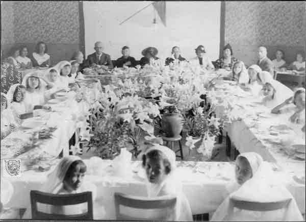 Desayuno de celebración de las primeras comuniones en el Liceo Benalcázar. Cali. C. 1940.