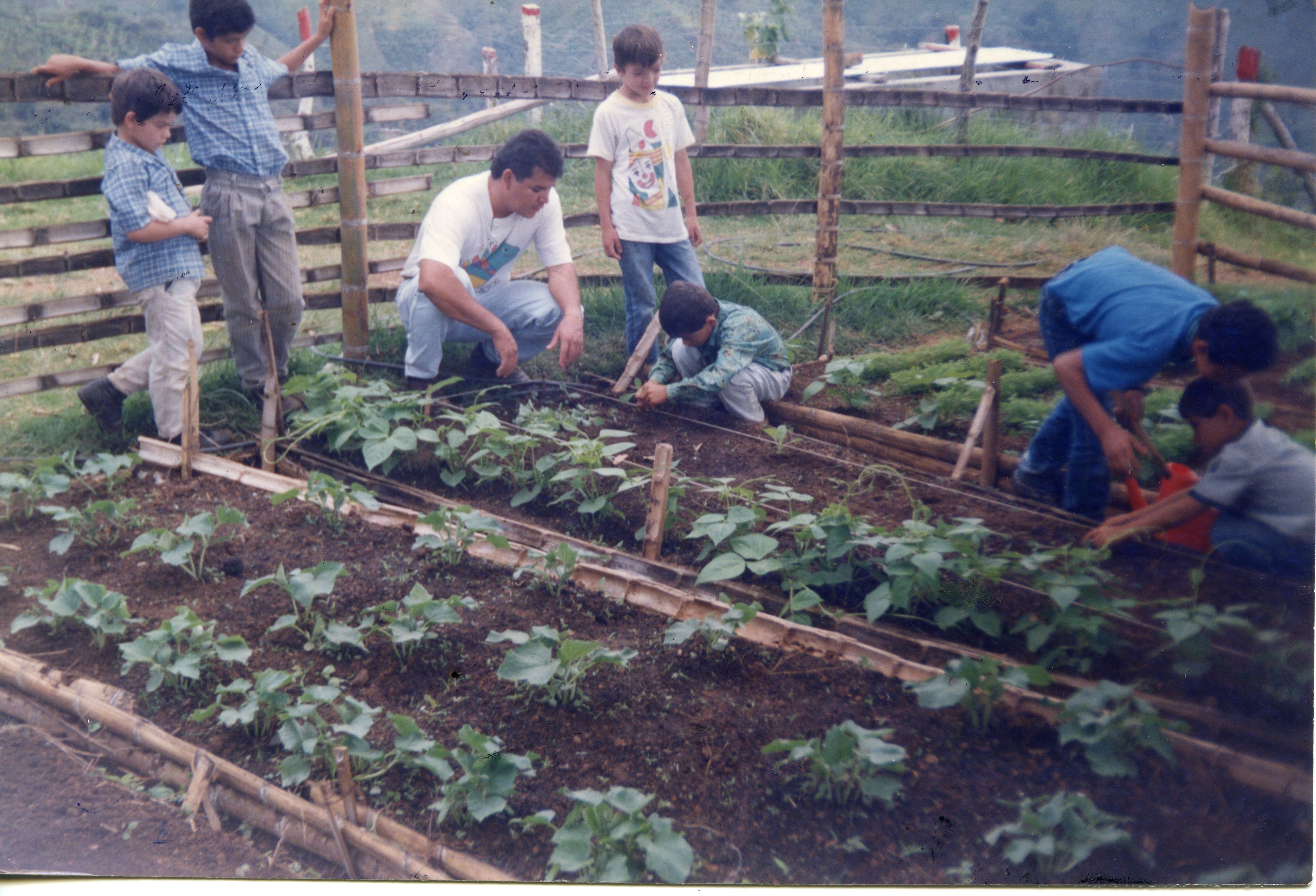 Reverso:"Roldanillo-.El jefe de la Umata de esta localidad Jhon William Alba León dirige los trabajos de las huertas caseras en varios corregimientos del municipio. La entidad entrega al campesino las semillas y los insumos. En la gráfica Alba León instruye a varios niños en el manejo de las huertas."