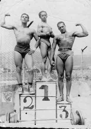 Ramiro Hurtado Quijano, Julián Cruz Fernández y otro competidor. Los tres pesistas se ubican después de unas competencias.