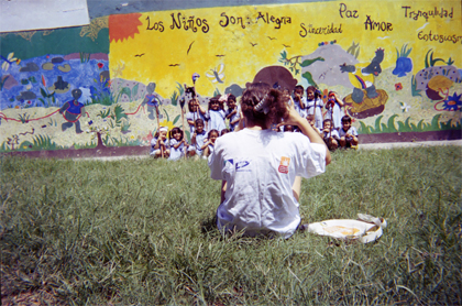En primer plano una mujer sentada en el piso imita con sus brazos la toma de una fotografía. Tiene puesta la camiseta del proyecto Cali Ciudad Visible. A su lado mochila del proyecto. Al fondo unos infantes posan para la toma. Sobresale mural con temas infantiles. Plano medio. Exterior día.