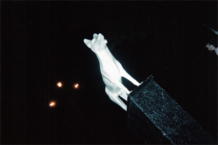 Monumento al can Teddy en el parque del perro del barrio San Fernando. Imagen tomada con flash. Al lado derecho el rostro de una niña. Al fondo luces de lámpara. Toma diagonal.