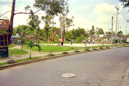 Plano Medio. Se destaca en el extremo inferior una vía pavimentada que dibuja una diagonal hacia la derecha. En la parte superior un parque con una cancha de baloncesto y un grupo de niños jugando en él.