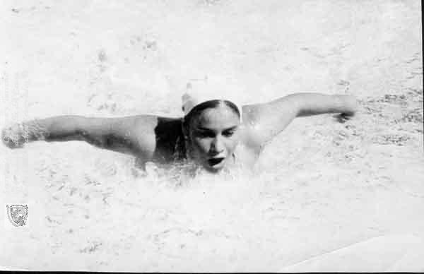 Olga Lucía de Angulo, deportista destacada de la ciudad, que logro varias medallas para su departamento y país. Santiago de Cali, C. 1972.