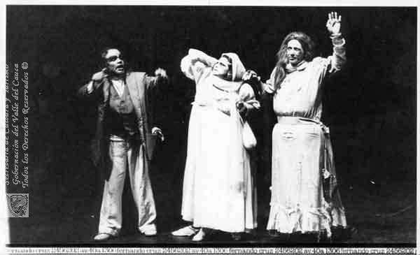 Obra de teatro "El viento y la ceniza", grupo de teatro La Candelaria, actores Fernando Peñuela, Inés Pietro y Nora Ayala, TEC. Cali. C. 1974.