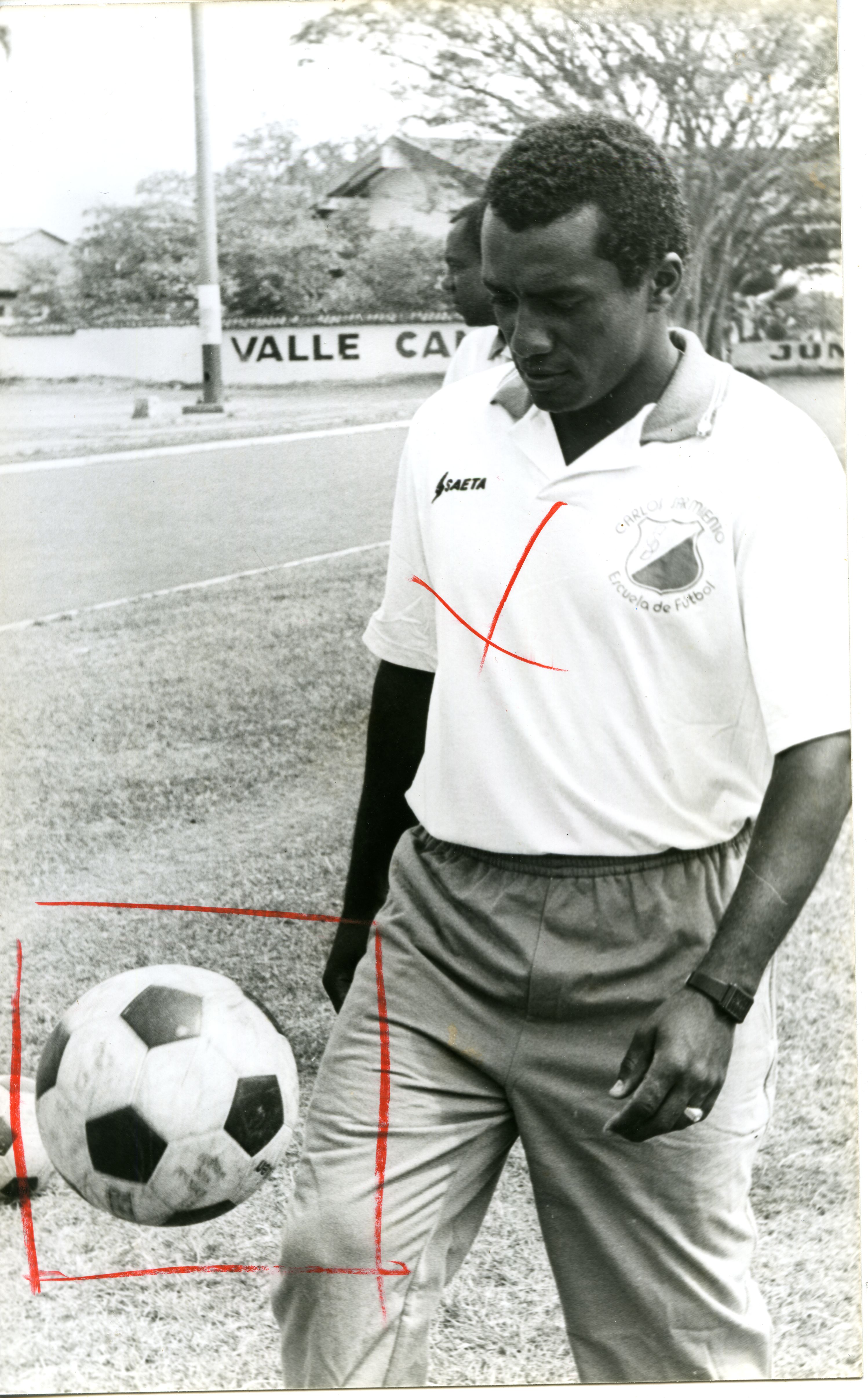 Foto cuerpo completo Gilmar Aponzá jugando con un balón que se encuentra en la esquina inferior izquierda
