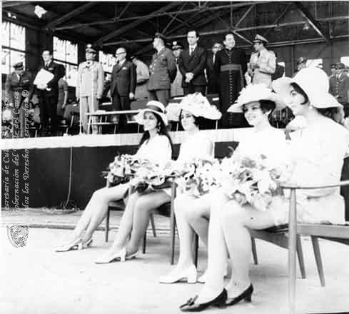 El Presidente de la República Carlos Lleras Restrepo, el Dr. Rodrigo Lloreda Caicedo, el arzobispo Alberto Uribe Urdaneta y Claudia Delgado, en una ceremonia en la Base Aérea Marco Fidel Suárez. Cali, C. 1965.