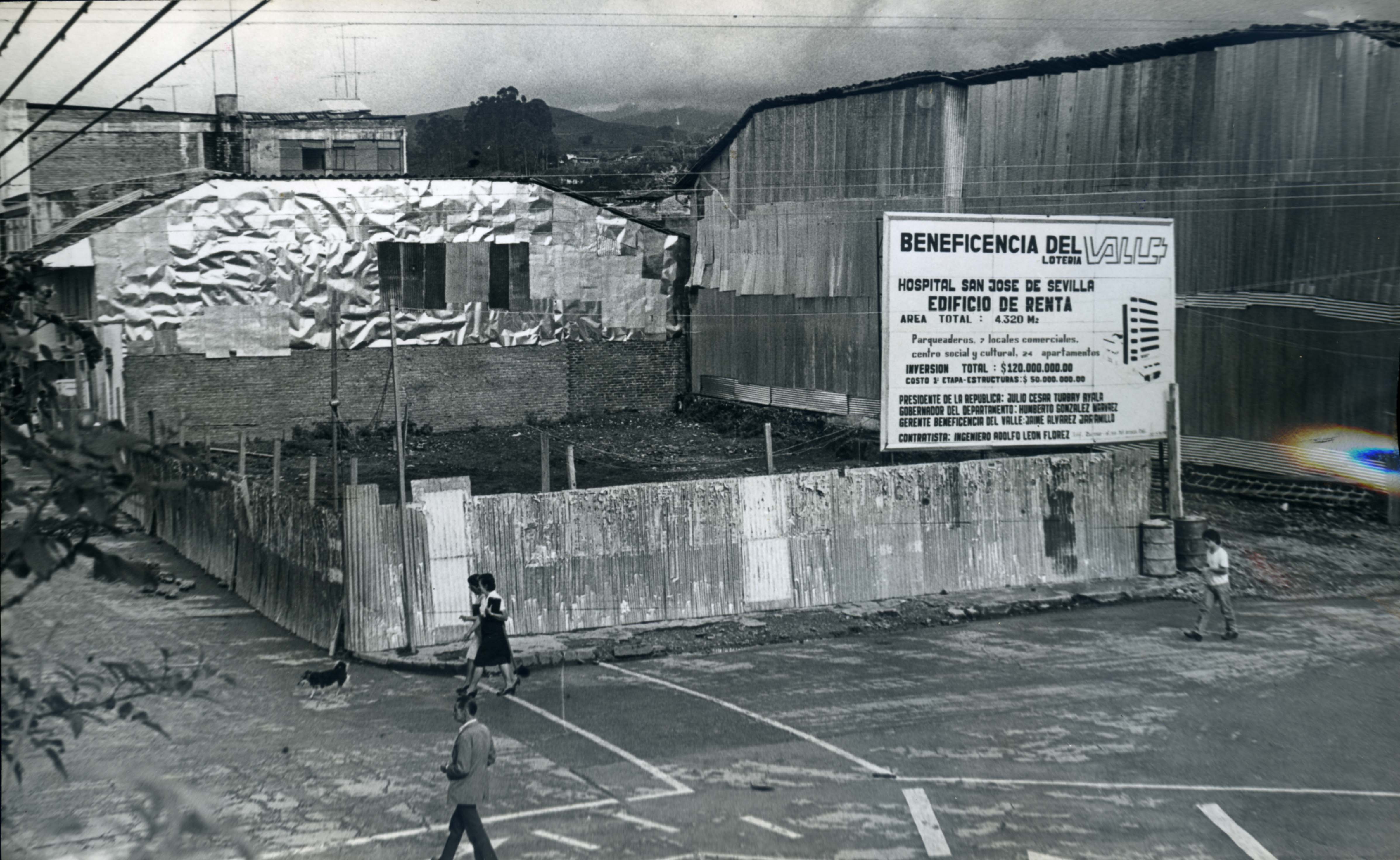 Información al reverso:En este lote será construído próximamente el edificio que servirá de rentas para el sostenimiento del Hospital San José. Está ubicado en plena plaza de La Concordia, es decir, en un sitio privilegiado, cuyas entradas económicas aportarían el dinero suficiente para el buen funcionamiento del centro asistencial regional. Se espera que la Beneficiencia del Valle lleve a la práctica esta importante iniciativa con la cual contribuiría al adelanto y progreso de la ciudad de Sevilla. Constará de nueve pisos y los trabajos tendrán un costo de 120 millones de pesos, de los cuales ya fueron apropiados 50 millones, por el anterior gerente de la Beneficiencia del Valle, el sevillano, Jaime Alvarez Jaramillo.