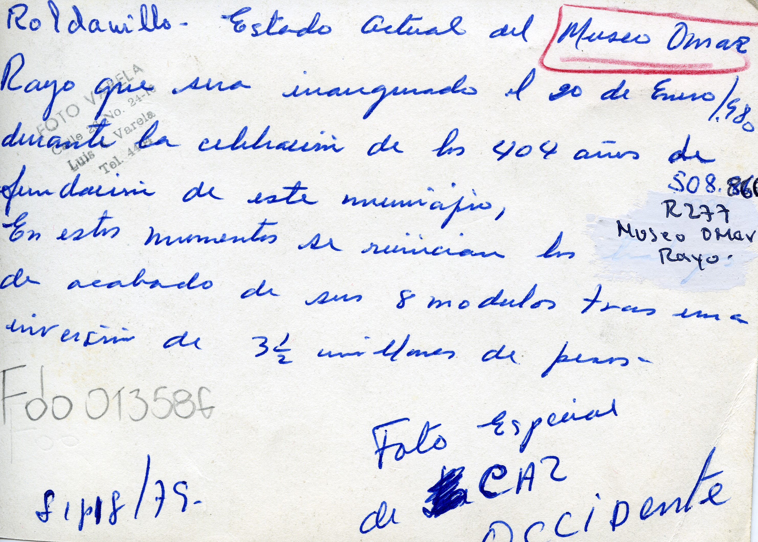Interiores del Museo Omar Rayo. Al reverso señala que su remodelación fue inaugurada el 20 de Enero de 1998 durante la celebración de los 404 años de fundación del municipio de Roldanillo.
