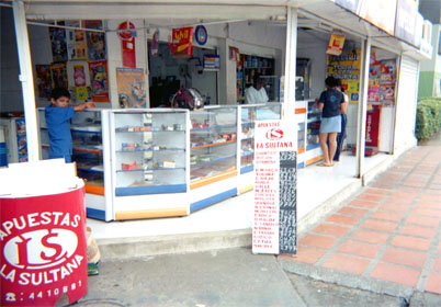 Plano de contexto. Toma lateral de tienda. Variedad de objetos. Tablero de apuestas en enfoque central, haciendo contrapunto a cubículo rojo en costado izquierdo inferior.