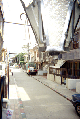 En primer plano lámpara. Se aprecia calle de barrio. Vía angosta. Plano general.