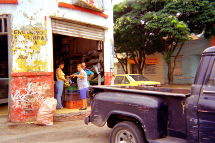 Exterior día. A la derecha y en primer plano , parte posterior de camioneta negra desvencijada. A la izquierda de la imagen, fachada despintada de granero esquinero. En el umbral de ingreso podemos distinguir a tres personas . El costal lleno que se encuentra a la entrada nos sugiere que venía en la camioneta. Arbol frondoso al fondo.