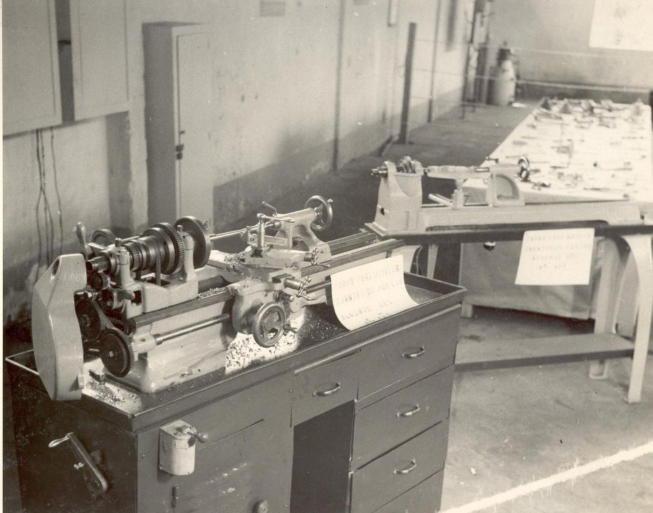 Taller de mecánica industrial, torno de metal construído por estudiantes del grado cuarto, de la Escuela de Artes y Oficios. Esta institución se creo por Acuerdo Municipal No 25 de 1933, que ordeno construir una escuela de formación técnico-práctica, para dar respuesta a la necesidad de mano de obra capacitada, requerida por el crecimiento industrial y urbano de la ciudad. A partir de 1945 se le empezo a llamar Instituto Antonio José Camacho. Actualmente se conoce como Instituto Educativo Técnico Industrial Antonio José Camacho. Santiago de Cali, fecha aproximada, 1948.