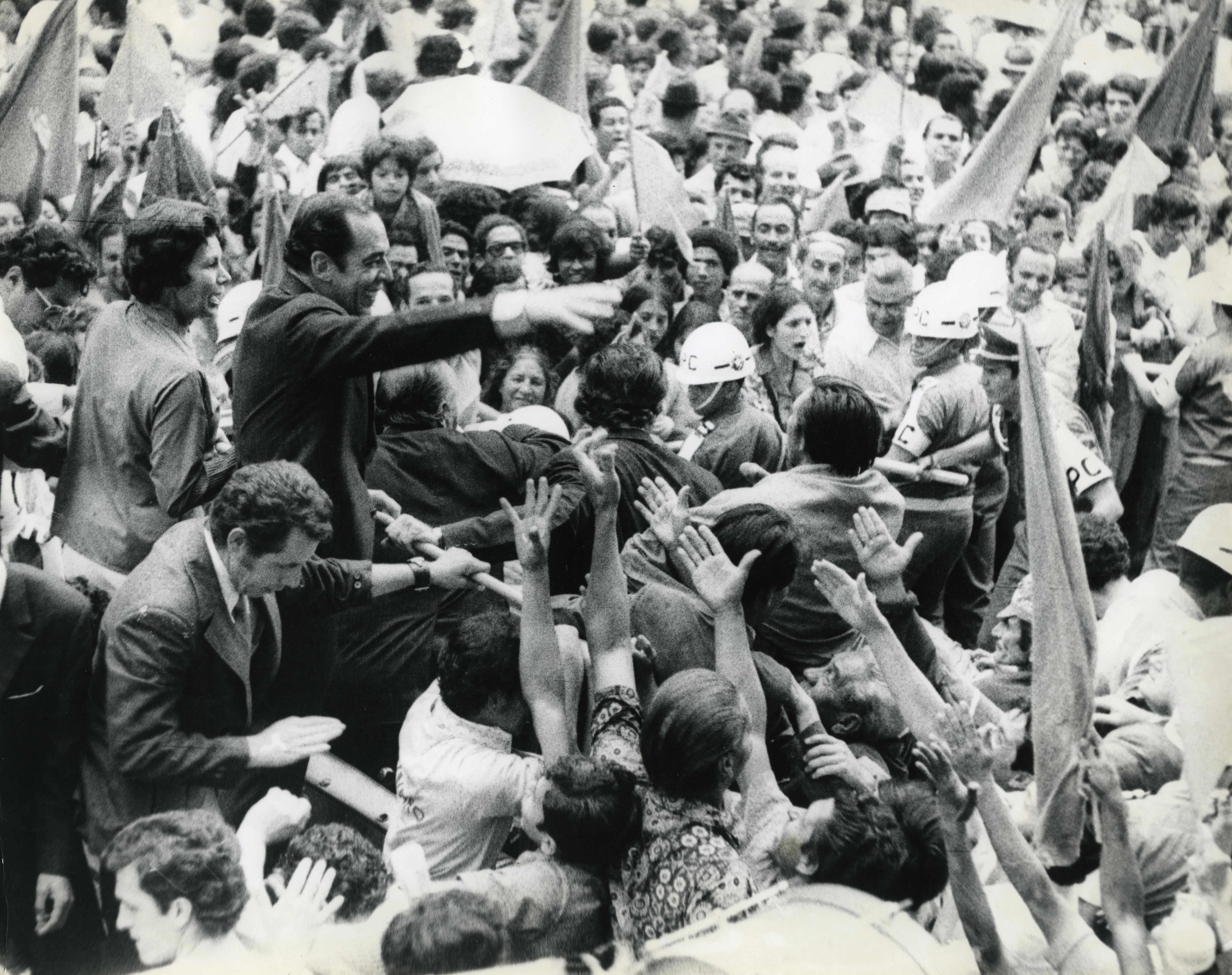 En la gráfica observamos a el político Álvaro Gómez Hurtado acompañado de su esposa en campaña electoral en la ciudad de Cali, en su momento fue candidato presidencial (1974) contra Alfonso López Michelsen
