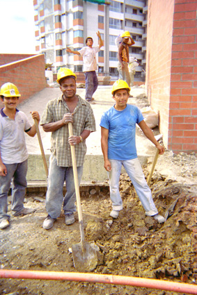 Plano medio. Se destaca la puesta en escena de tes hombres que desempeñan la labor de la construcción. Al fondo dos hombres más saludando a la cámara.