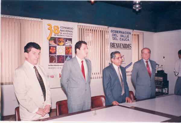 Celebración del 38 Congreso Nacional de Sociedades de Mejoras Públicas. En la mesa el doctor Nicolás Ramos Gómez y Jorge Montalvo, entre otros por identificar. Santiago de Cali, C. 1994.