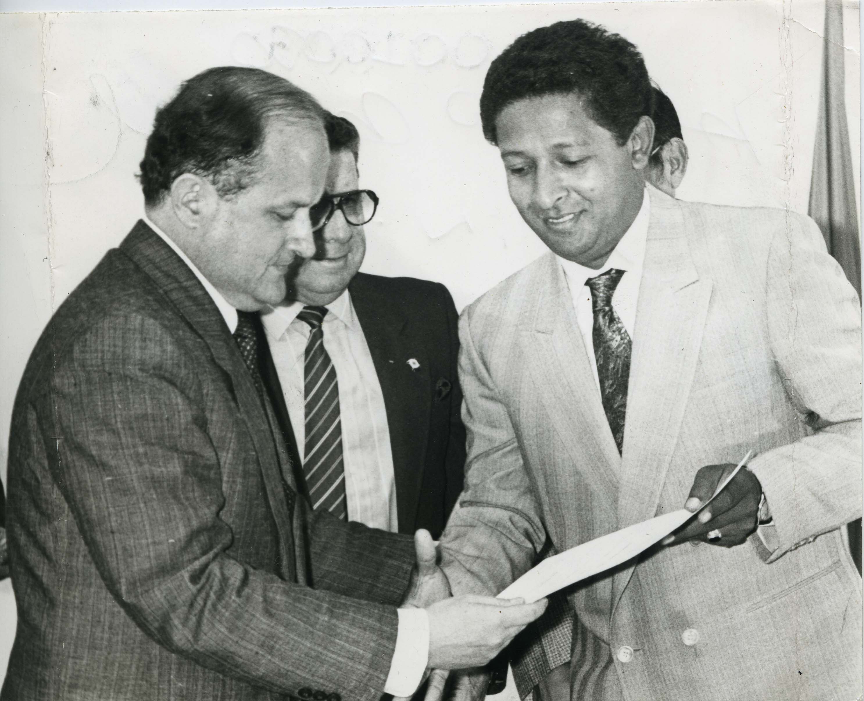 Diario Occidente (1991). El alcalde Germán Villegas Villegas y Álvaro Miguel Medina, de Caracol radio. Santiago de Cali: Biblioteca Departamental Jorge Garcés Borrero.