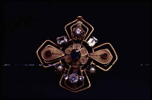 Broche en plata dorada y filigrana engastada. Convento San Joaquín y Museo Religioso. Cali, C. 1995