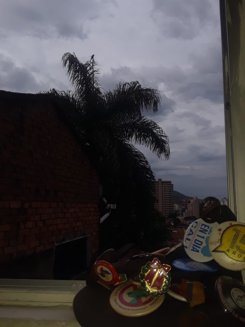 Vista desde la ventana a la ciudad, se divisa una palmera, una pared y algunos edificios al fondo al igual que el cielo.