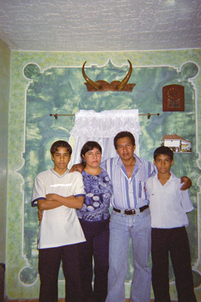 Plano medio, Familia conformada por cuatro personas. Al fondo un muro de color verde con algunos elementos decorativos. Imagen tomada con lflash.