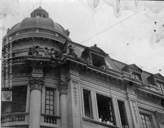 FOTO ESCARRIA (1940). Maniobras del Cuerpo de Bomberos en el Palacio Nacional, Plaza Cayzedo & 501273. OTRO: Biblioteca Departamental Jorge Garces Borrero.
