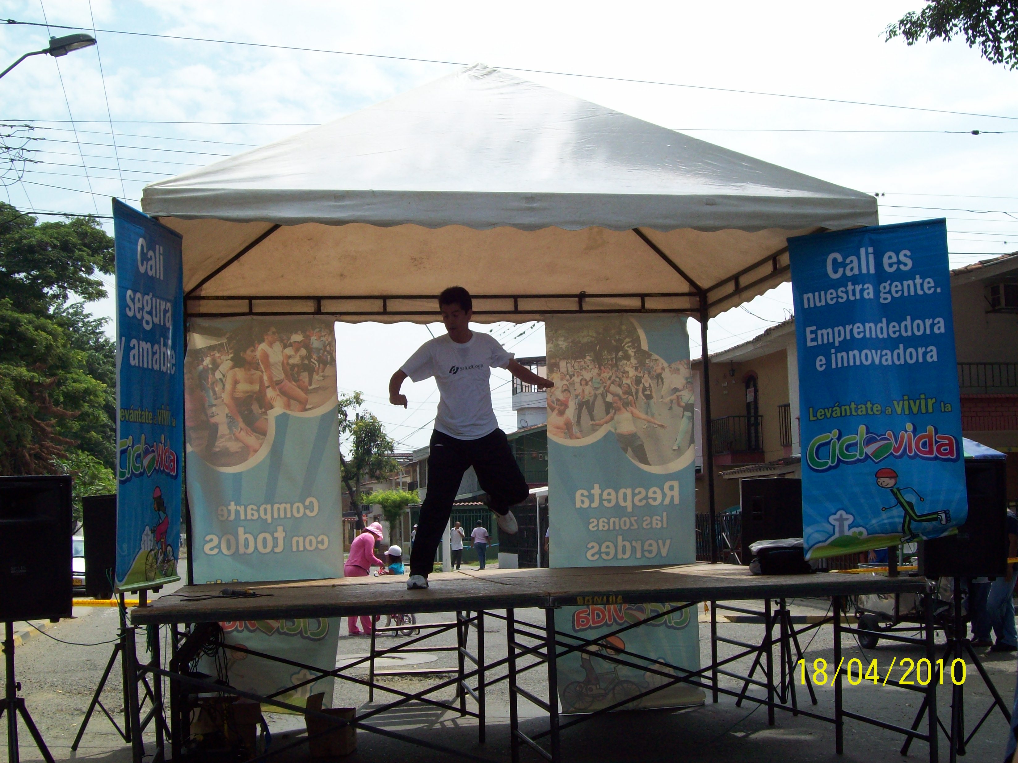 La CicloVida de Cali, es un programa de la Alcaldía de Santiago de Cali, liderado por la Secretaría del Deporte y Recreación, actividad incluyente para toda la ciudadanía, donde se cierran temporalmente las calles para los vehículos y se abren para los habitantes de la ciudad, todos los domingos de 8:00 am a 1:00 pm para que disfruten de un espacio seguro y gratuito para que en familia o amigos disfruten de la actividad física, recreación, deporte y cultura. Se aprecia en la imagen, instructor Carlos Cardona en clases de aeróbicos. Observamos al profesor en tarima haciendo los ejercicios dirigidos a los asistentes