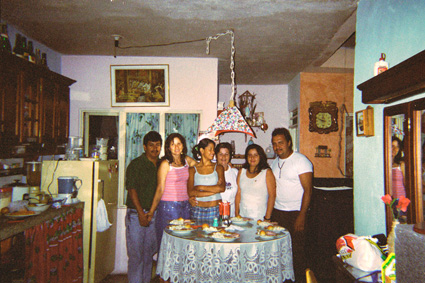Plano medio de un grupo familiar conformado por seis personas, en el interior de una vivienda, con escasas condiciones de luz. El grupo está parado detrás de una mesa con los alimentos servidos. La imagen es tomada con flash.