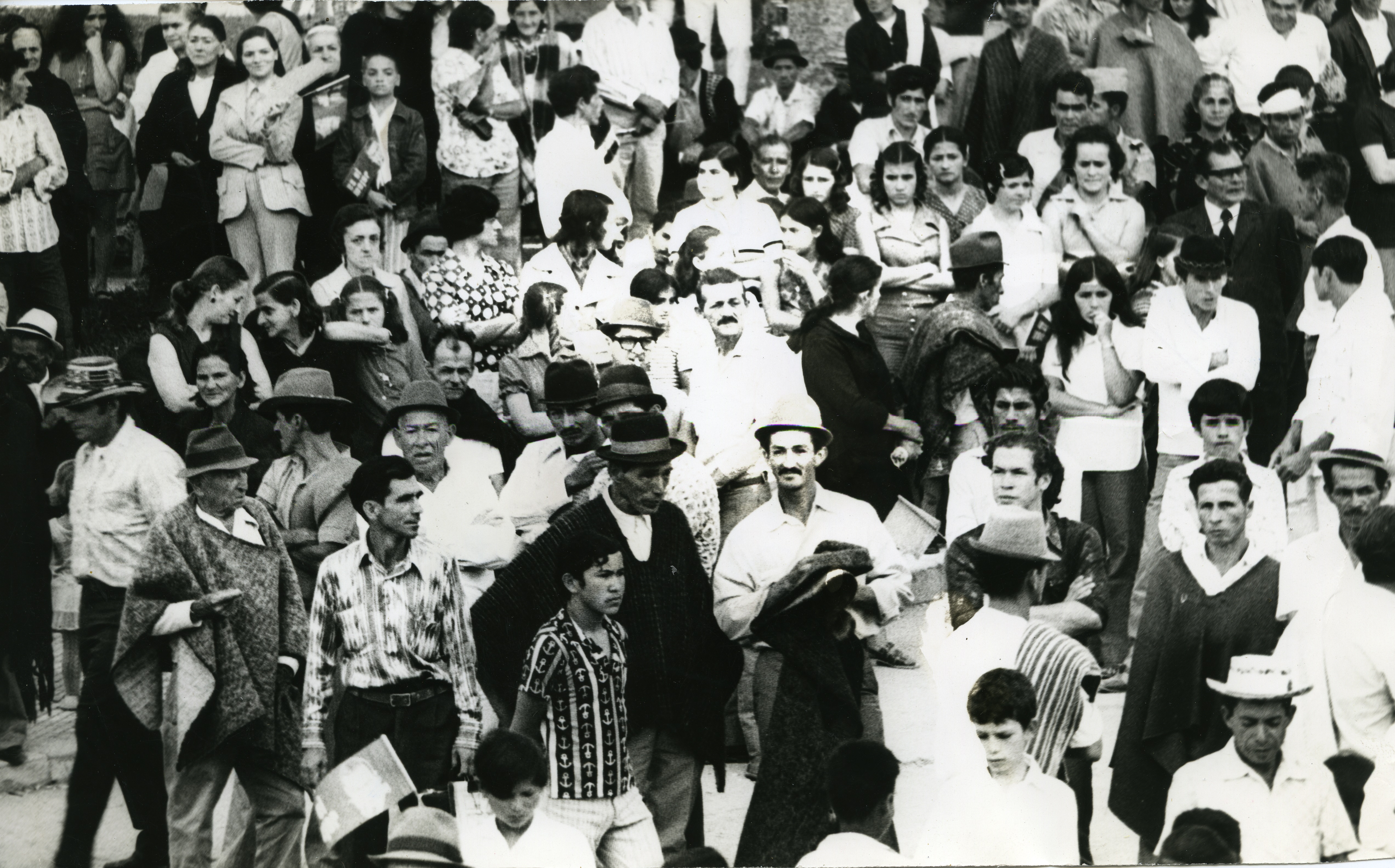 Grupo de personas reunidas, algunas tienen en sus manos banderitas.