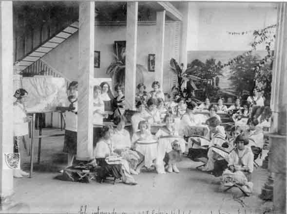 Internado Sagrado Corazón de Jesús. Estudiantes en clase de manualidades y arte. Primera de izquierda a derecha. Nubia Victoria, Elcita Caldán, Esther Castaño, Sofía Palacios, Olga Laura Castaño, Olga, Alicia Holguin, Limbanía Domínguez, América Rey(su padre Emiliano, fue senador por el Partido Liberal), Mary Roldán, Silvia Gardeazábal Potes, Amelia Toro, María Josefa, Emelina Escobar ( se caso con Jorge Victoria), Felicia Rey, Aurita Domínguez, Neyla, Reverenda Madre Cristina, directora del costurero (europea, que murió en Panamá), Tuluá. 1927.