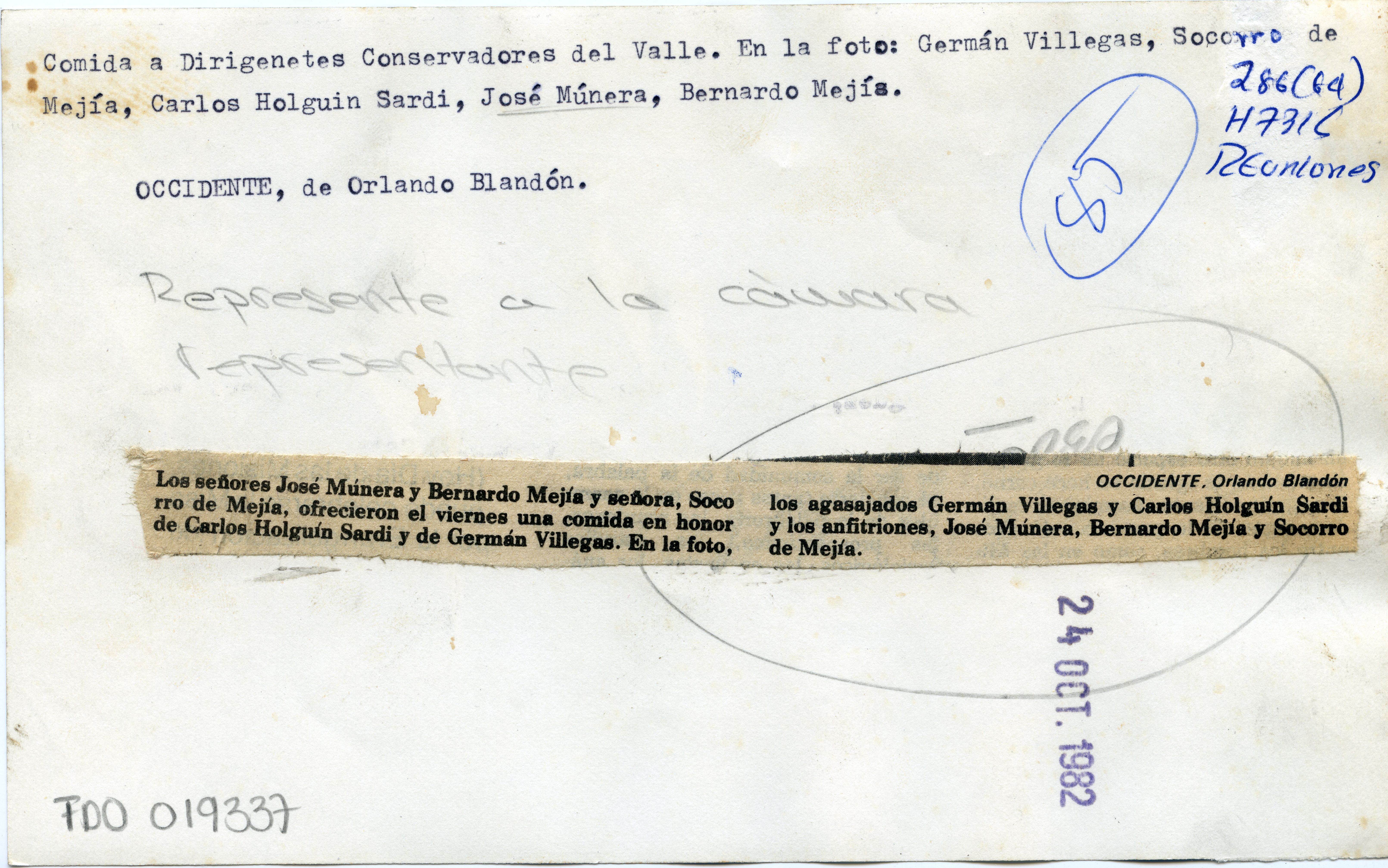 | dc.description.abstract | Enla fotografia podemos observar a Carlos Holguín Sardi junto a Germán Villegas, José Múnera, Bernardo Mejía y Socorro de Mejía, en un evento realizado en honor a los dirigentes conservadores. Al reverso de la fotografía se anexa recorte: "Los señores José Múnera y Bernardo Mejía y señora, Socorro de Mejía, ofrecieron el viernes una comida en honor de Carlos Holguín Sardi y de Germán Villegas. En la foto, los agasajados Germán Villegas y Carlos Holguín Sardi y los anfitriones, José Múnera, Bernardo Mejía y Socorro de Mejía." | spa |
