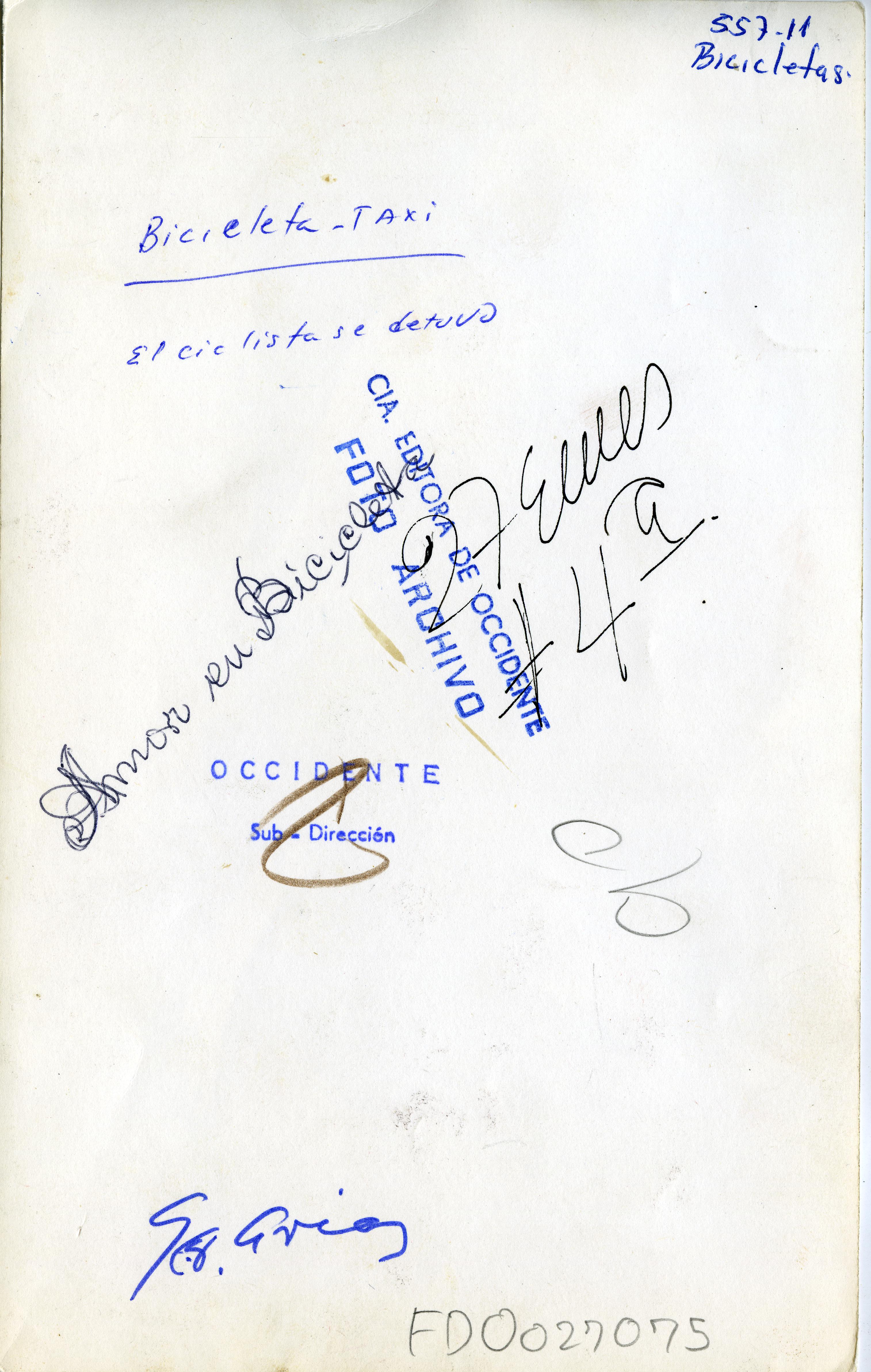 Manuscrito: Bicicleta-taxi. El ciclista se detuvo