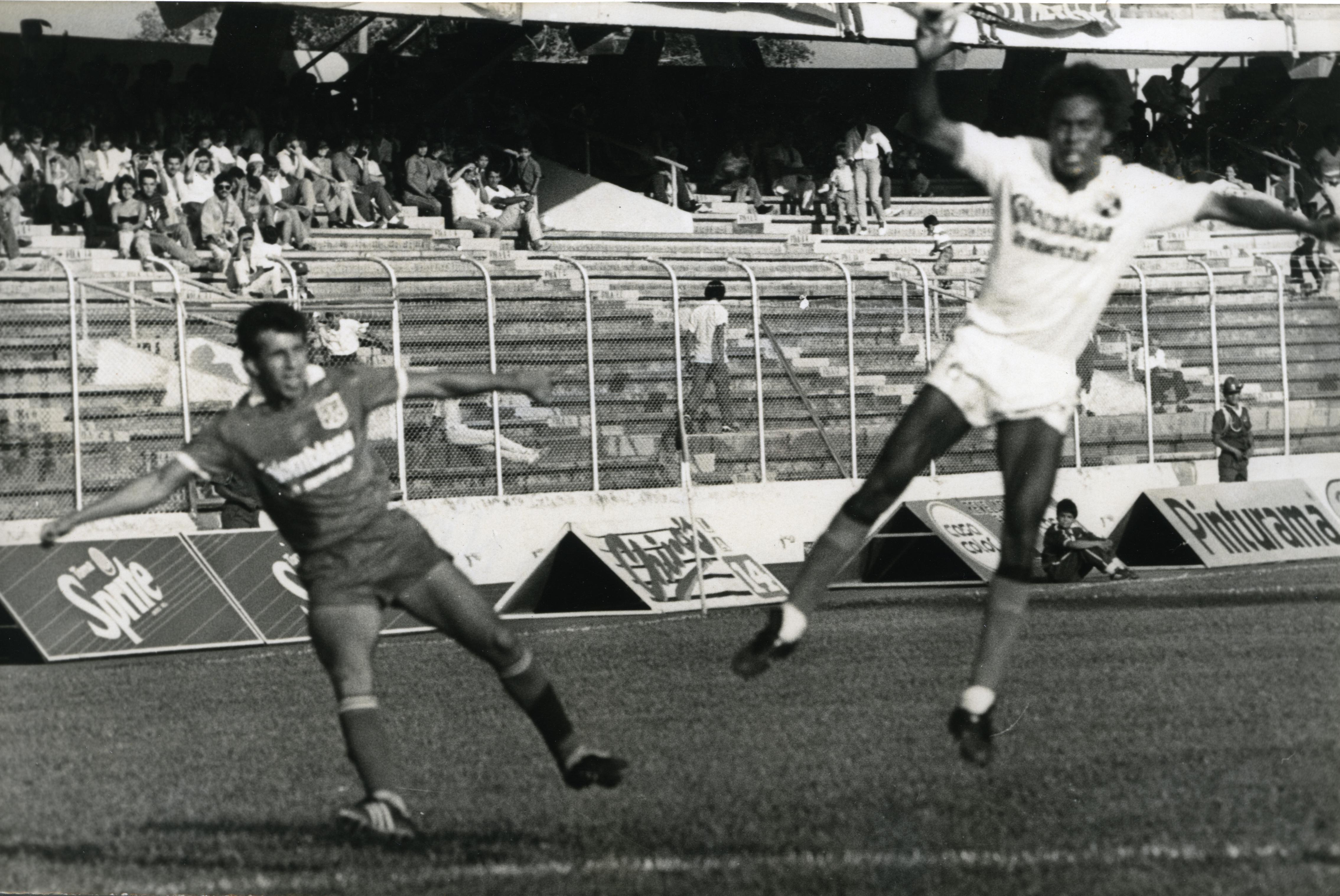 En la foto se aprecia al jugador del América de Cali, Mario Coll disputa el balón