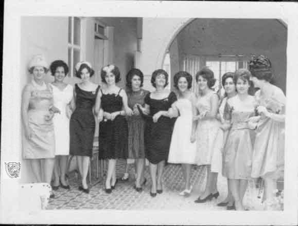 Matrimonio de Luz Estella Mejía, la compañan sus amigas Lía Vélez, Martha Lucía Morales, Blanca Victoria Salazar, Amparo Velázquez, Licenia Parra, Matilde Giraldo, Luz Estella Mejía, Ruby Gamboa, Nelly Aristizabal y Anita Borrero. Club Naútico Río Cauca. Cartago. 1962.