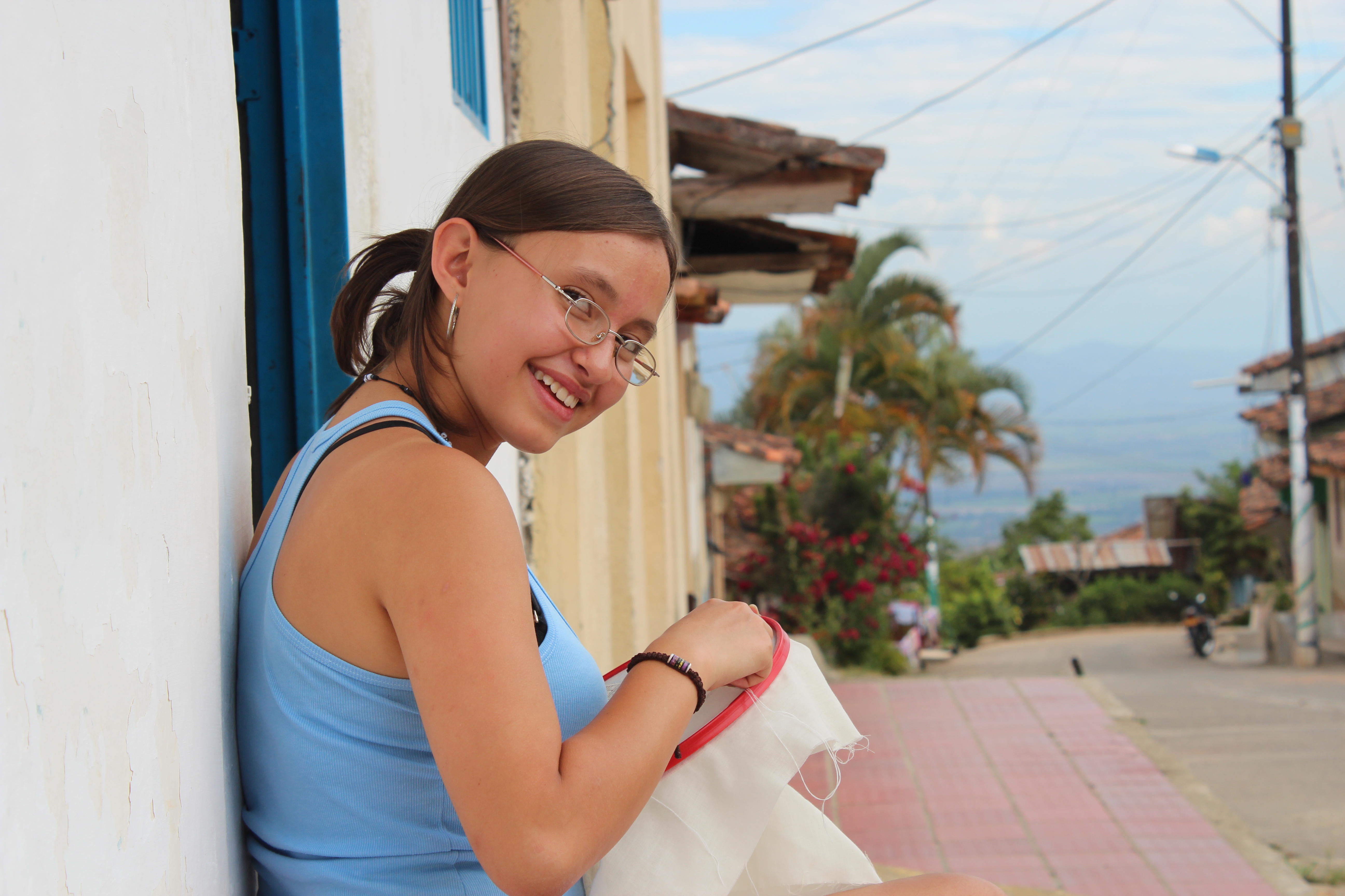 Ansermanuevo, Valle del Cauca. Fundado 15 agosto de 1539, por el Mariscal Jorge Robledo, Se convirtió en municipio por ordenanza 29 de abril de 1925. Mujer tejiendo. Se aprecia las calles y el paisaje al fondo