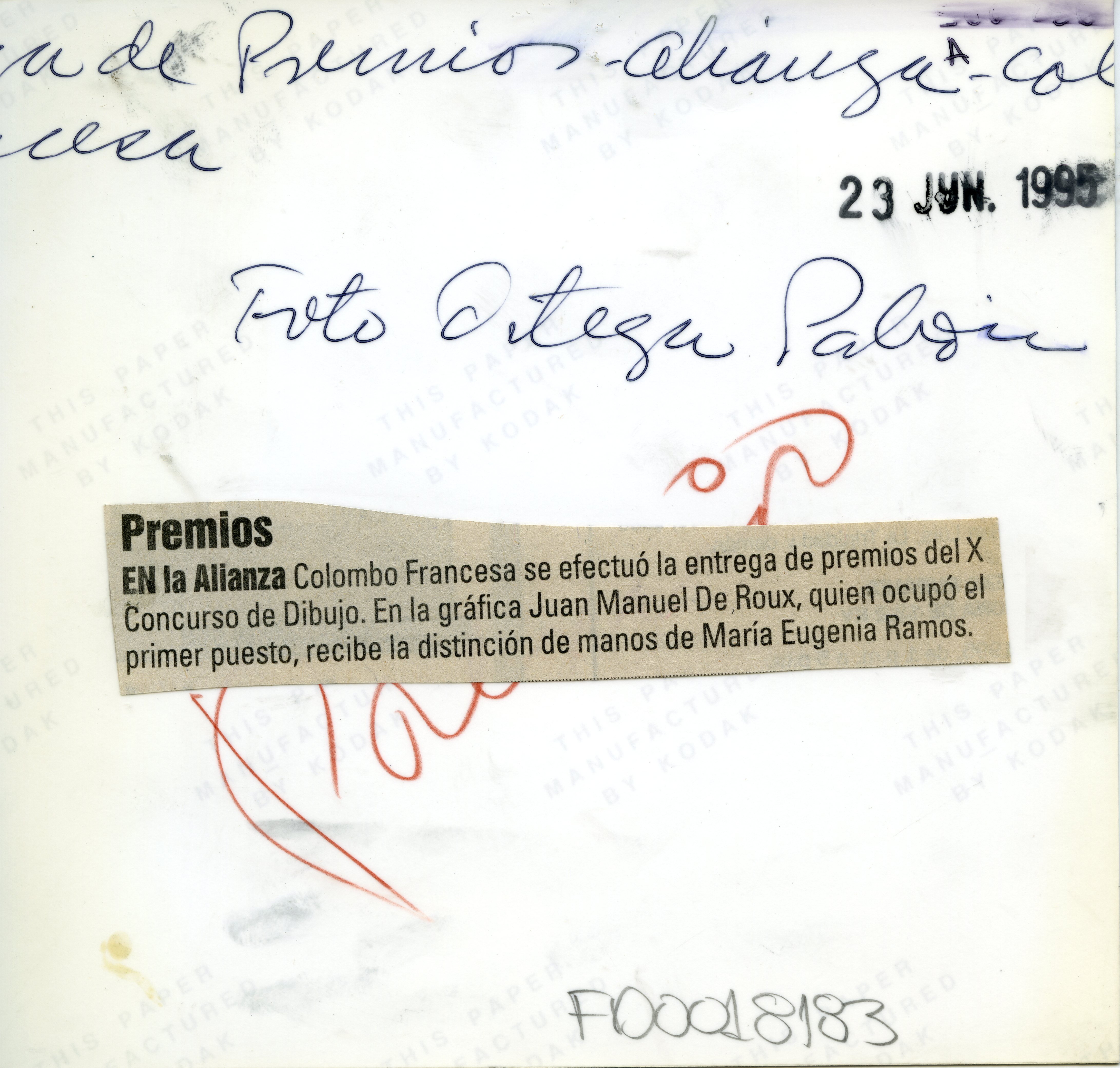Al reverso de la fotografía se anexa recorte:" Premios en la alianza Colombo Francesa se efectuó la entrega de premios del X concurso de dibujo. En la gráfica Juan Manuel de Roux, quien ocupó el primer puesto, recibe la distinción de manos de María Eugenia Ramos."