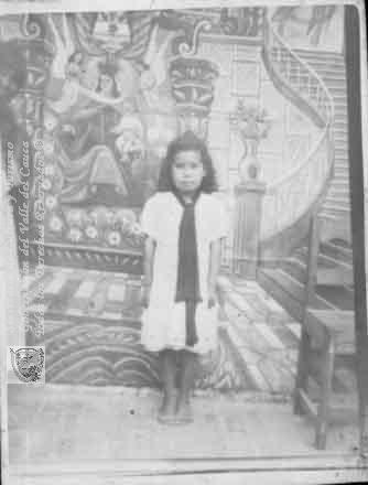 Estefanía Chilito detrás un mural de la vírgen María. Cali. C. 1927.