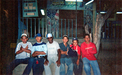 Grupo de jóvenes del barrio Remanso de Comfandi en el exterior de un local comercial. Plano medio. Imagen tomada con flash.