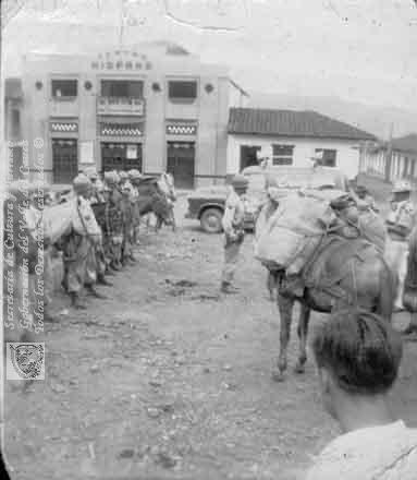 Cuerpo de policías. Al fondo el Teatro Hispano. Darién, Parque Principal, 1950.