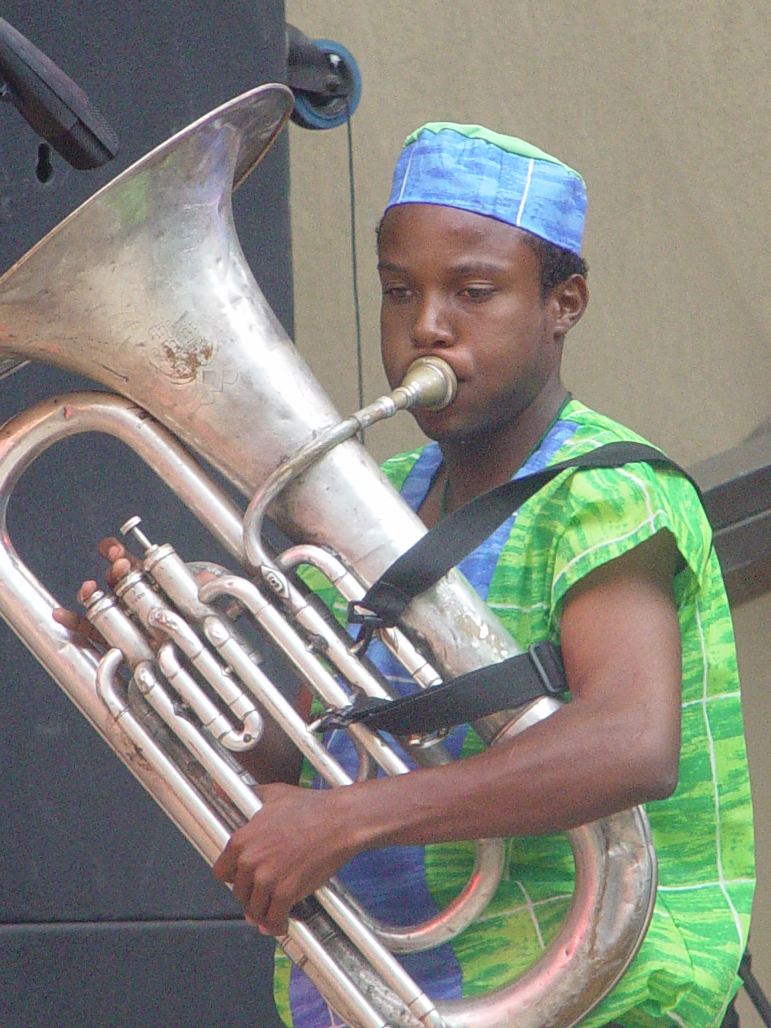 Plano medio de músico con tuba. Participante del del 8 Festival de Música del Pacífico "Petronio Álvarez".