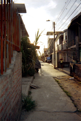 Solano Candazuri, Y. V. (2005). Plano general toma realizada en exterior, donde se aprecia un sendero peatonal que conduce a través de varias viviendas. Santiago de Cali: Biblioteca Departamental Jorge Garces Borrero.