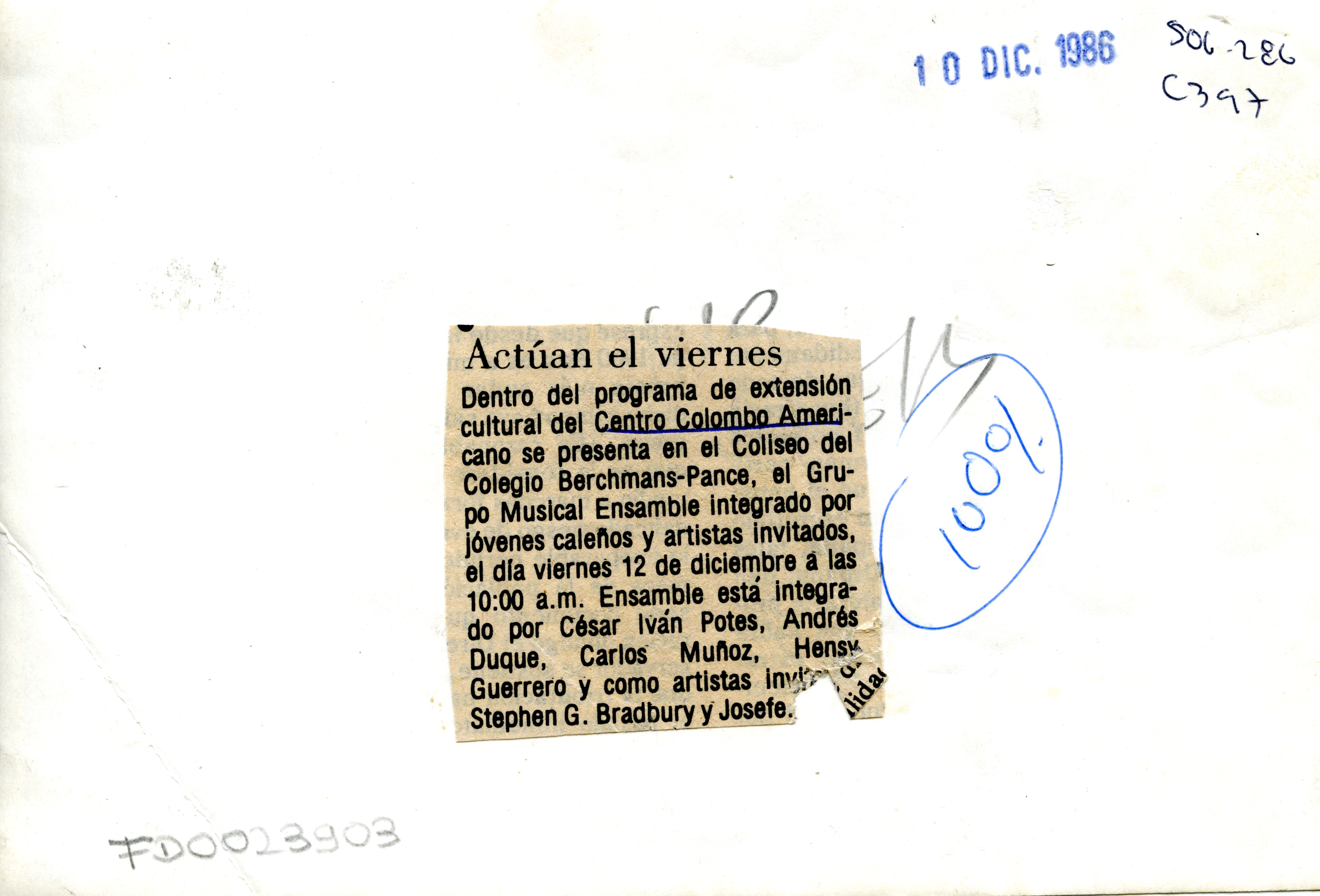 Al reverso de la fotografía se anexa recorte: Dentro del programa de extención cultural del Centro Colombo Americano se presenta en el coliseo del colegio Berchmans - Pance, el grupo musical Ensamble integrado por jóvenes caleños y artistas invitados el día viernes 12 de diciembre a las 10:00 a.m. Ensamble esta integrado por César Iván Potes, Andrés Duque, Carlos Muñoz, Ensy Guerrero y como artista invitado Stephen G. Bradbury y Josefe