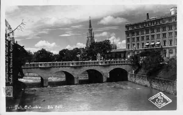 Panorámica del Puente Ortíz. Construido a mediados del siglo XIX por Fray José Ignacio Ortíz. Hoy constituye uno de los mas importantes símbolos arquitectónicos de la ciudad. Santiago de Cali, fecha aproximada, 1950.