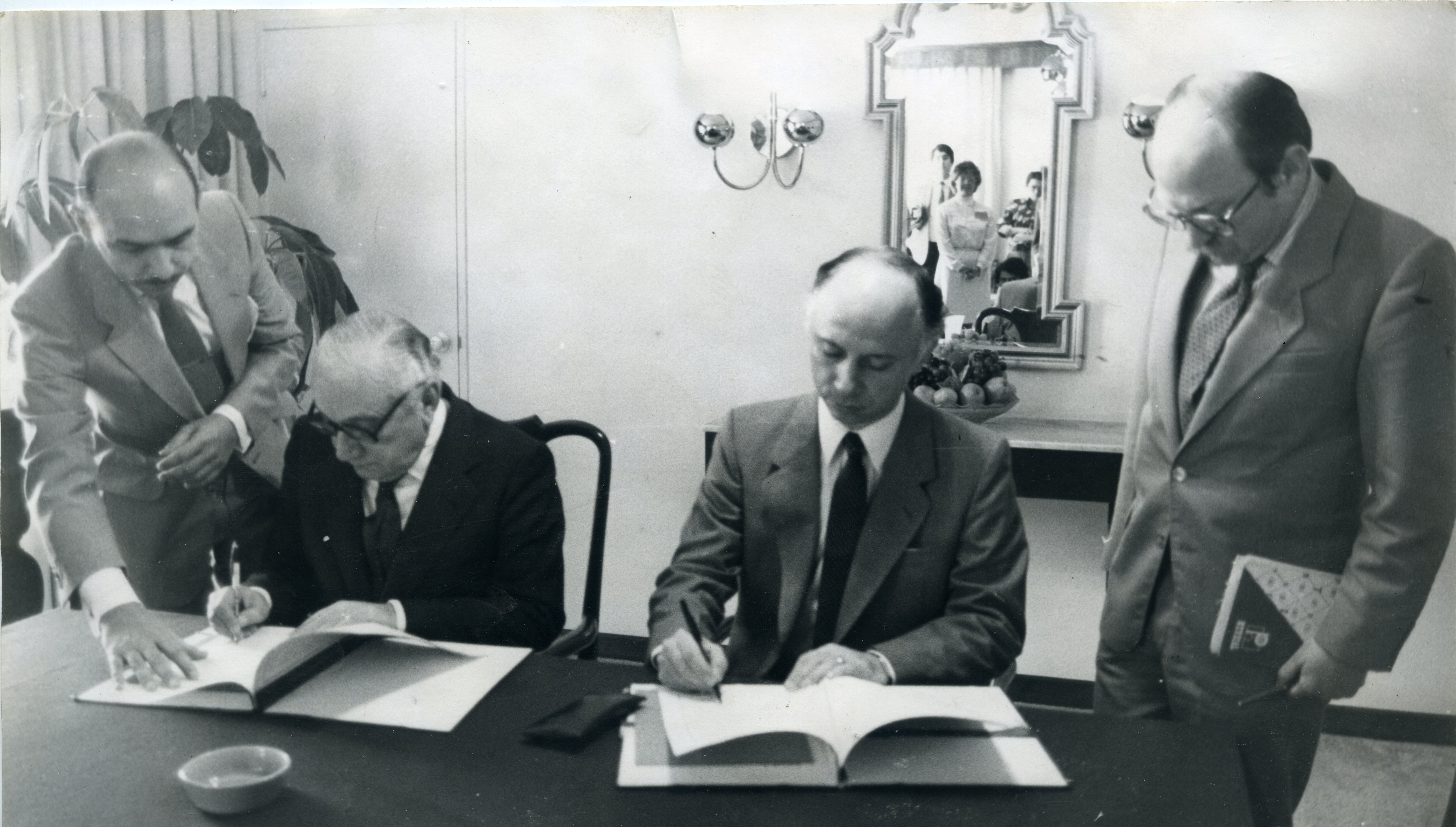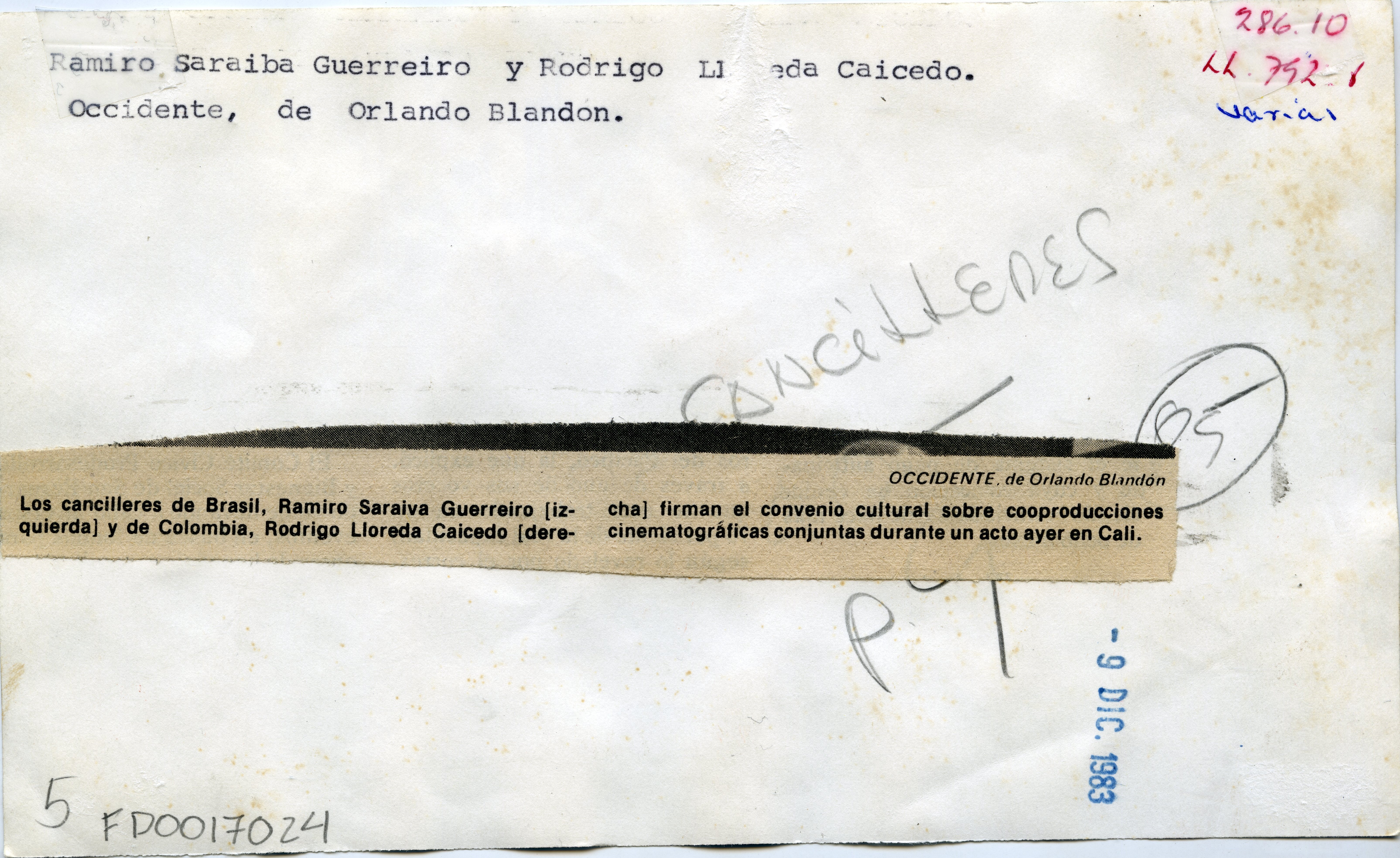 Al reverso de la fotografía se anexa recorte: "Los cancilleres de Brasil, Ramiro Saraiva Guerreiro (izquierda) y de Colombia, Rodrigo Lloreda Caicedo (derecha), firman el convenio cultural sobre cooproducciones cinematográficas conjuntas durante un acto ayer en Cali."